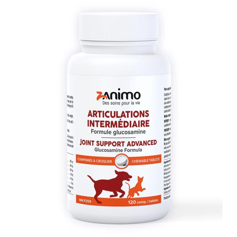 Intermédiaire avec glucosamine contribue à la mobilité et à la souplesse des hanches et des articulations. Elle supporte la santé du cartilage et des os, favorise la flexibilité et maintient le confort articulaire. Cette recette unique est l’une des meilleures options à donner à son animal qui souffre de douleurs articulaires et de raideurs au lever. Elle contient une synergie de 6 ingrédients actifs et efficaces qui ont démontré des résultats visibles en 10 jours.