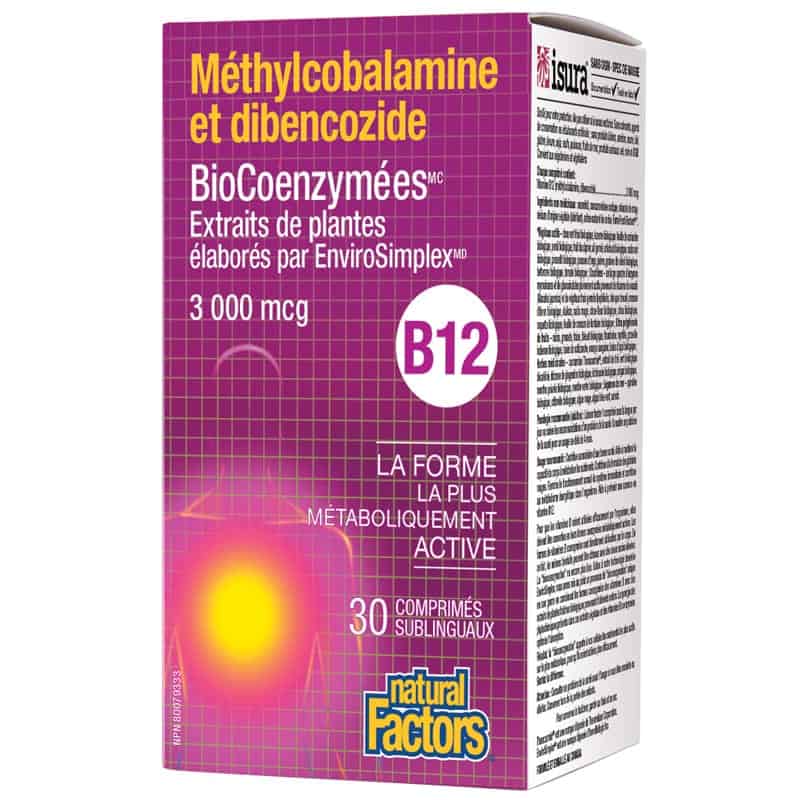 Méthylcobalamine et dibencozide de Natural Factors fournit des formes bioactives de vitamine B12 associées au mélange de phytonutriments bioactifs Farm Fresh Factors MC permettant une absorption supérieure. Ce supplément de vitamine B12 aide à prévenir la carence en ce nutriment essentiel, soutient la formation des globules rouges, favorise une fonction immunitaire normale, et contribue au métabolisme énergétique et au maintien de la santé. Cette préparation « un-par-jour » renferme de la méthylcobalamine et du dibencozide, deux formes de vitamine B12 coenzymée extrêmement biodisponibles. Une coenzyme est un composé naturel qui se lie à des enzymes spécifiques pour favoriser des réactions métaboliques bénéfiques dans l’organisme. Les formes coenzymatiques préformées de vitamines B offrent un soutien nutritionnel direct et immédiat, même aux personnes chez qui des différences génétiques altèrent le métabolisme des vitamines B courantes. La vitamine B12 Méthylcobalamine et dibencozide BioCoenzymées de Natural Factors est un supplément sublingual sans gluten et non OGM qui convient aux végétariens et aux végétaliens. Il est également idéal pour ceux qui ont du mal à avaler les pilules.