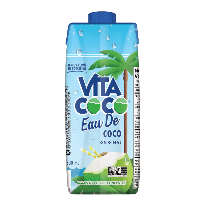 Eau de coco, moins de 1 % de sucre naturel de fruit, vitamine C