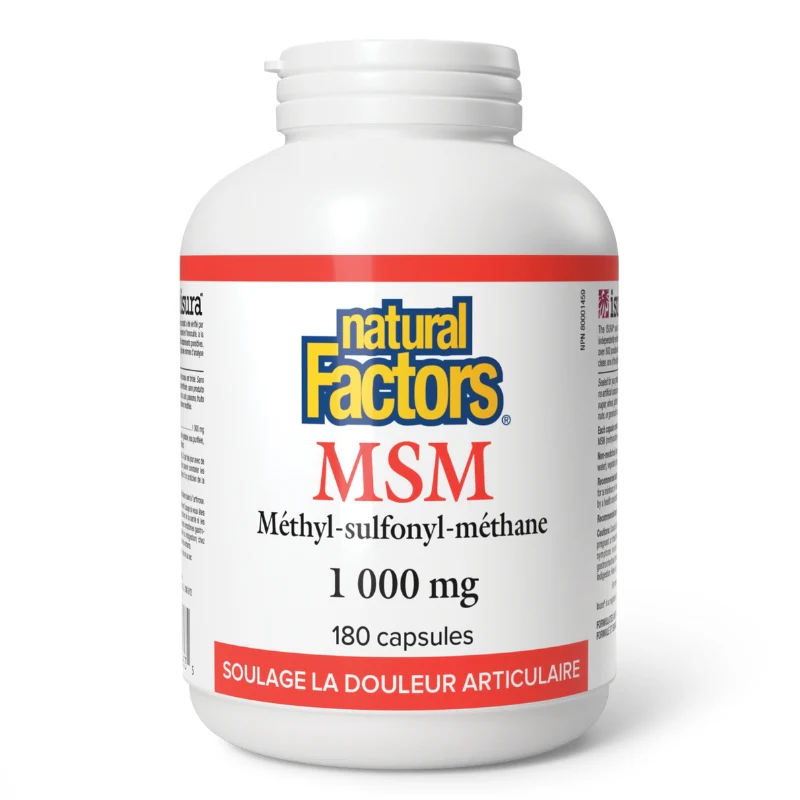 Le méthylsulfonylméthane (MSM) soulage naturellement la douleur articulaire en favorisant la formation de tissu conjonctif sain dans les articulations et les muscles. Il est également utilisé par le corps pour produire le collagène nécessaire à la santé de la peau, des cheveux et des ongles. MSM de Natural factors peut aider à améliorer le bien-être et la mobilité des gens atteints d’arthrose.