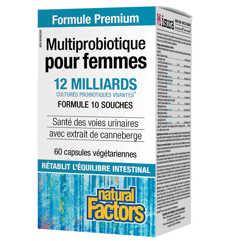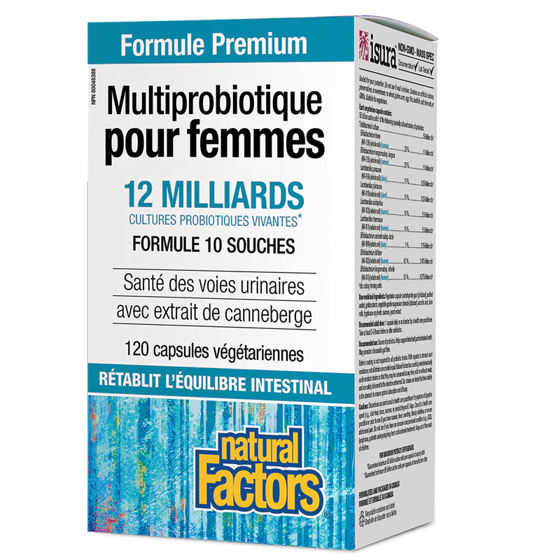 Multiprobiotique pour femmes de Natural Factors est une préparation composée de 10 souches probiotiques qui soutiennent la santé des voies intestinales, vaginales et urinaires. Cette formule contient également 300 mg de CranRich, concentré 36:1 de canneberge qui aide à prévenir les infections récidivantes des voies urinaires chez les femmes tout en favorisant une fonction digestive normale.