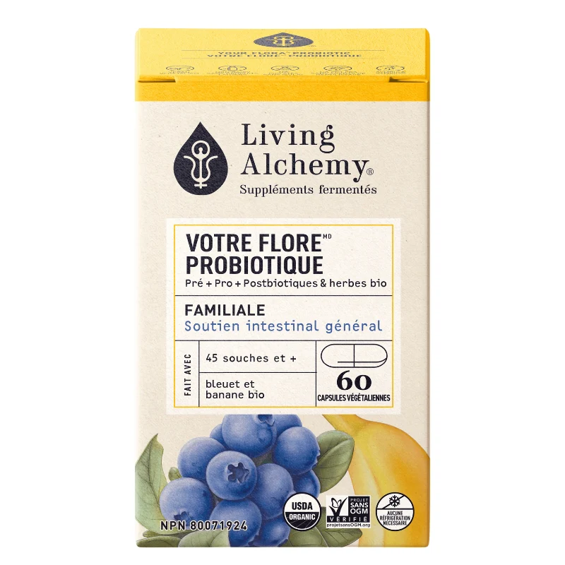 Notre Votre flore ® probiotique Famille est un symbiote de soya fermenté à 45+ souches diverses de kéfir-kombucha avec des probiotiques, des prébiotiques et des postbiotiques pour soutenir la santé de la flore intestinale.