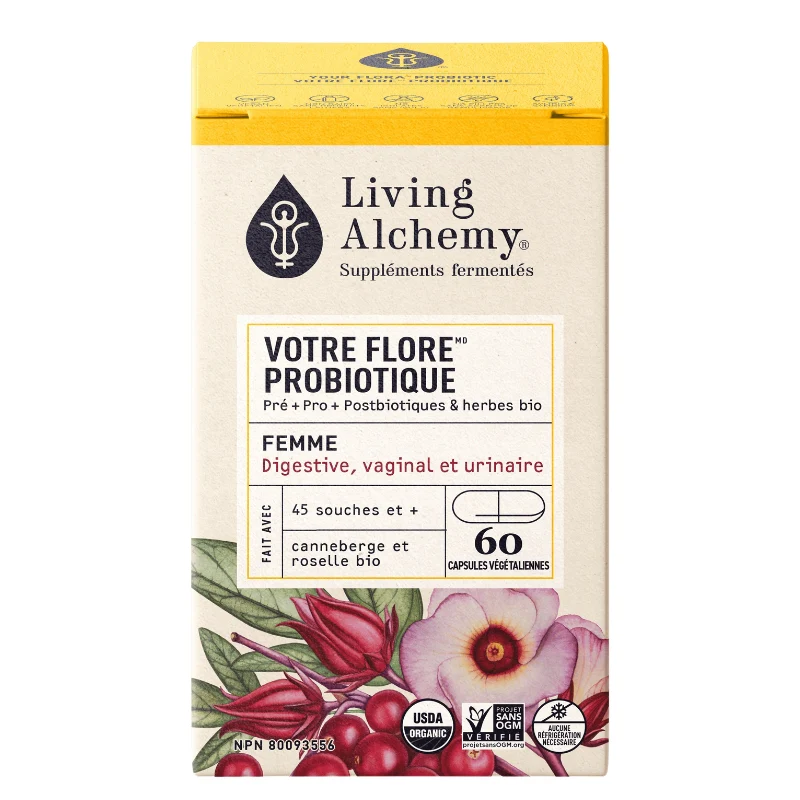 Votre flore® femme combine notre symbiotique fermenté Kéfir-Kombucha de plus de 45 souches variées avec des plantes ciblées, notamment la roselle et la canneberge biologiques, spécifiquement pour le soutien des voies digestives, vaginales et urinaires.