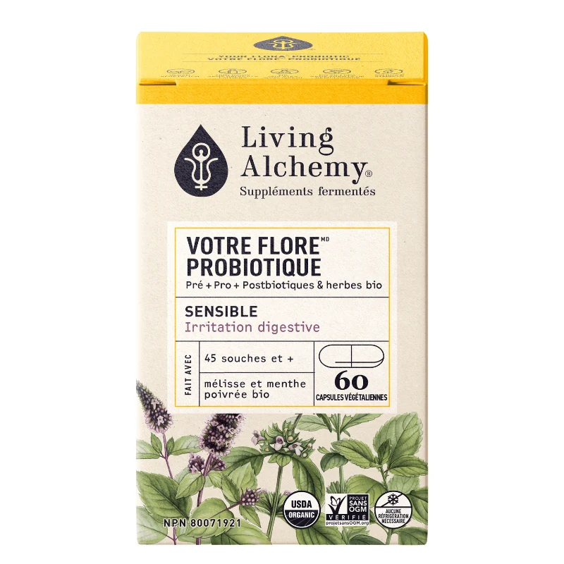 Notre Your Flora ® Sensitive est un symbiotique de soja fermenté au kéfir-kombucha composé de plus de 45 souches diverses avec des probiotiques, des prébiotiques et des postbiotiques pour soutenir une flore intestinale saine.