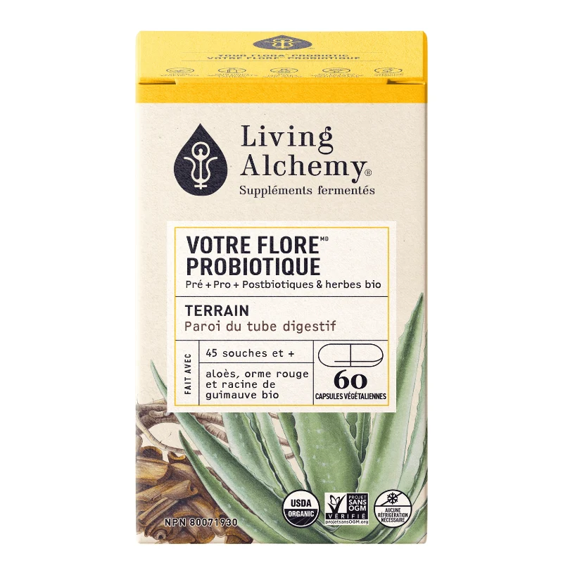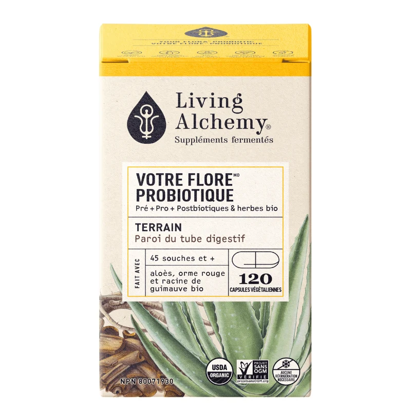 Notre Votre flore® terrain, un symbiotique fermenté Kefir-Kombucha à 45+ divers, est associé à des ingrédients à base de plantes organiques et non OGM ciblés comme l’aloe vera, l’orme glissant et la racine de guimauve pour réparer et fournir des nutriments tout en soulageant une doublure intestinale compromise.