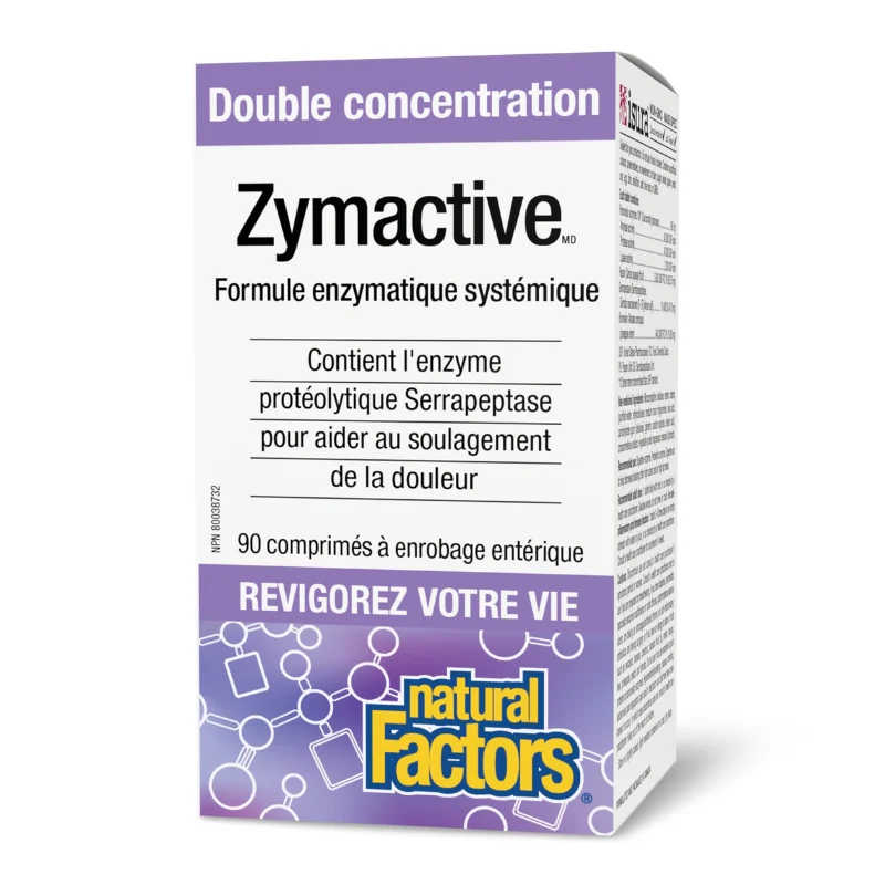 Zymactive Double concentration de Natural Factors est une préparation enzymatique systémique qui a plus de quatre fois la concentration des autres suppléments d’enzymes protéolytiques. Cette combinaison unique d’enzymes protéolytiques décompose les protéines qui causent l’inflammation et la douleur. Les comprimés à enrobage entérique protègent les enzymes contre l’acide gastrique pendant la digestion.
