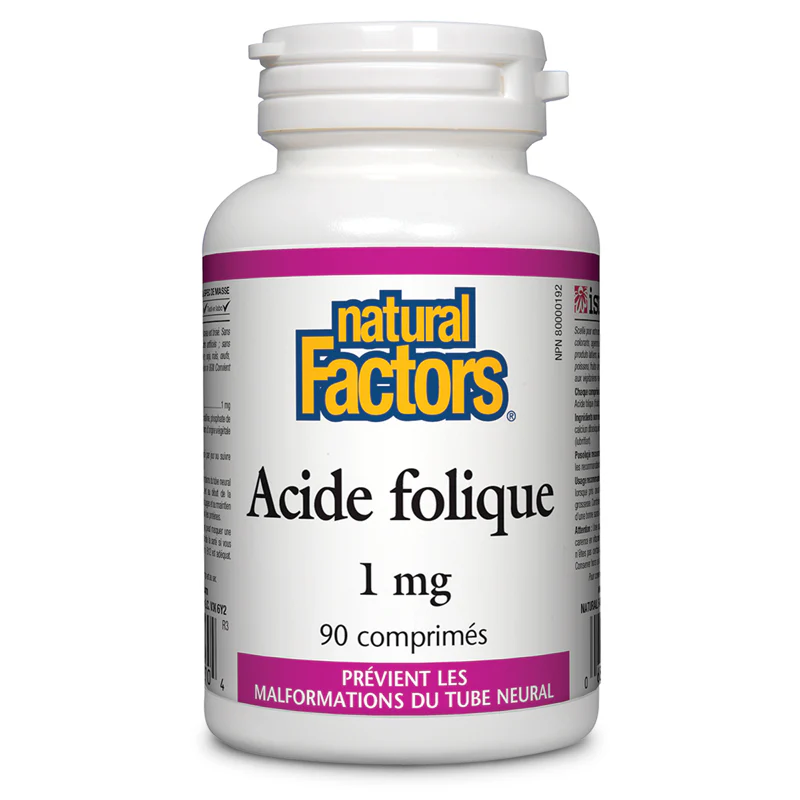 L’acide folique, également appelé folate, fait partie du complexe des vitamines B. Il agit comme coenzyme pour la synthèse de l’ADN et de l’ARN. Il joue donc un rôle important pour la division et la réplication cellulaires. L’acide folique intervient dans la production d’énergie et la formation des globules rouges. L’acide folique est une vitamine importante durant la grossesse. Il aide à réguler la formation des cellules nerveuses de l’embryon et du fœtus, fonction vitale au développement normal. Il peut aider à prévenir les anomalies du tube neural (comme le spina bifida), lorsqu’il est pris avant et pendant le premier trimestre de la grossesse. Avec les vitamines B12 et C, il participe au métabolisme des protéines et est utilisé pour prévenir et traiter l’anémie par carence en acide folique. De plus, il est impliqué dans la santé du système circulatoire en faisant baisser les taux d’homocysténe, un acide aminé qui peut endommager l’appareil cardiovasculaire en abîmant le revêtement de la paroi des vaisseaux sanguins. L’acide folique offert sous forme de supplément est plus biodisponible que celui obtenu dans les aliments. Chaque comprimé d’Acide folique de Natural Factors procure 1 mg de cette vitamine qui contribue grandement au maintien d’une bonne santé.