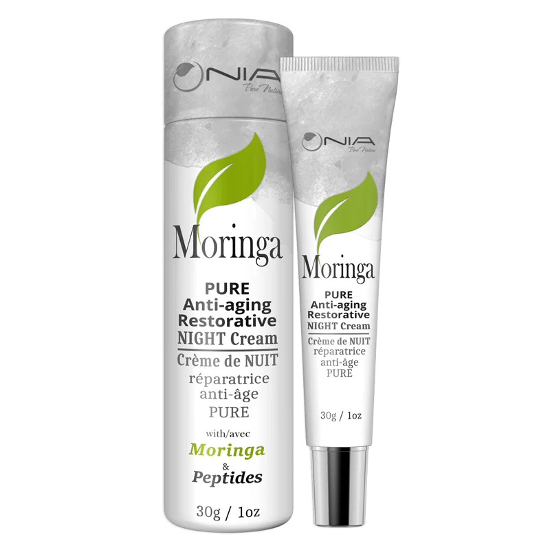 - L’huile de moringa biologique contenue dans cette crème de nuit nourrit et répare votre peau pendant le sommeil. L’huile de Moringa biologique contient 72% d’acides oléiques, 36 types d’antioxydants, des vitamines A et E, de l’acide linoléique, des acides gras oméga et 46 types d’agents anti-inflammatoires. Il élimine et prévient les imperfections, les points noirs et les rides. Il minimise les pores et raffermit la peau pour une peau naturelle, éclatante et jeune.