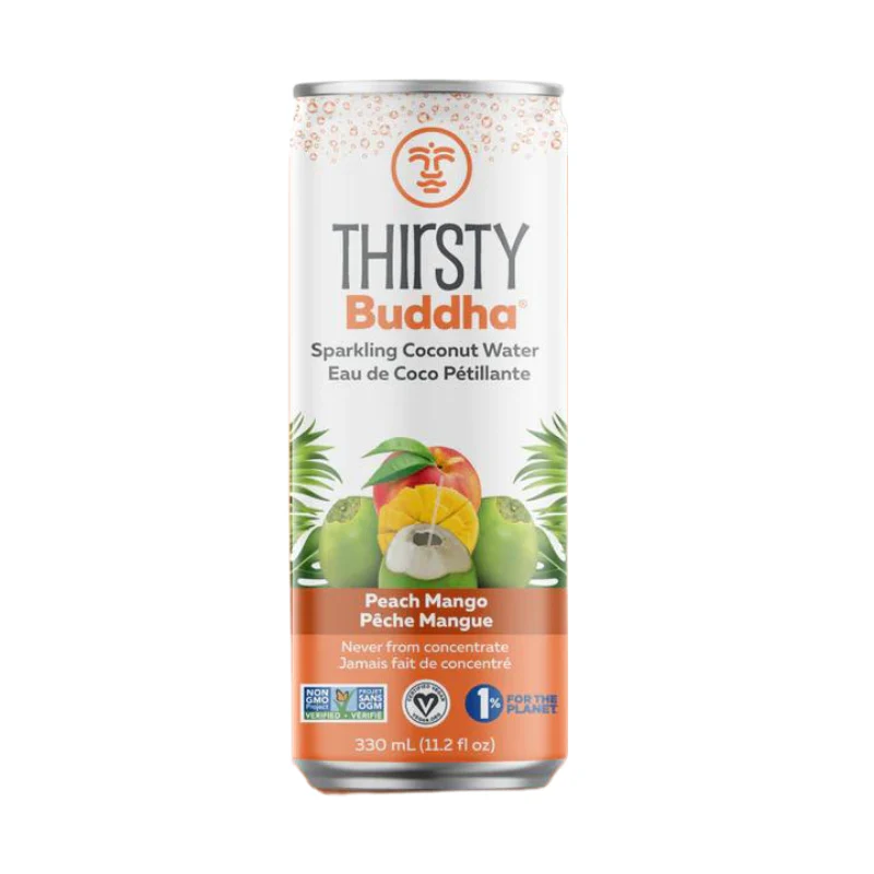 Toujours désaltérante, et maintenant pétillante! Notre eau de noix de coco pétillante combine l’eau de noix de coco nutritive – pleine d’électrolytes et de qualités régénératrices – avec une combinaison de saveurs classique : pêche et mangue!