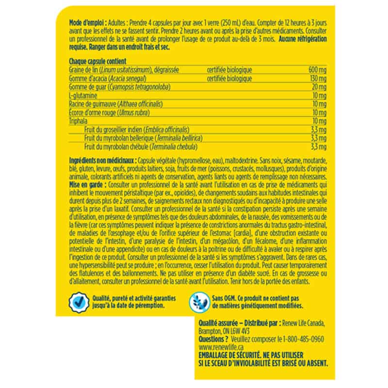 Graine de lin dégraissée (Linum usitatissimum) * certifiée biologique 5 500 mg; Gomme d’acacia (Acacia senegal) * certifiée biologique 1 400 mg; Gomme de guar (Cyamopsis tetragonoloba) 400 mg; L-glutamine 50 mg Racine de guimauve (Althaea officinalis) 50 mg; Écorce d’orme rouge (Ulmus rubra) 50 mg; Triphala 50 mg Fruit de groseillier à maquereau (Emblica officinalis) 16,7 mg; Fruit de myrobolan bellerique (Terminalia bellirica) 16,7 mg; Fruit de myrobolan chébulique (Terminalia chebula) 16,7 mg.