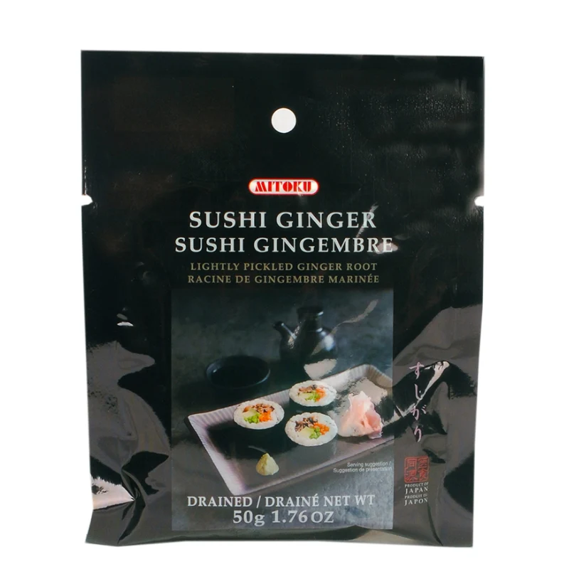 Pour faire du gingembre à sushi, de jeunes racines de gingembre tendres sont tranchées finement. Elles sont ensuite brièvement pressées au sel, puis marinées dans un mélange de vinaigre. Ils sont ainsi nommés car ils sont presque toujours servis avec des sushis ou des sashimis (poisson cru). Le gingembre peut être servi en tout temps comme aide digestive et complément de goût avec les repas, en particulier ceux comprenant du poisson. Il stimule l’appétit, revigore les papilles gustatives et facilite la digestion. Pratiques, car ils sont prêts à être consommés directement de l’emballage. Le gingembre Mitoku sushi n’est pas sucré et sa couleur est naturellement dérivée des feuilles de shiso rouge (herbe de périlla).