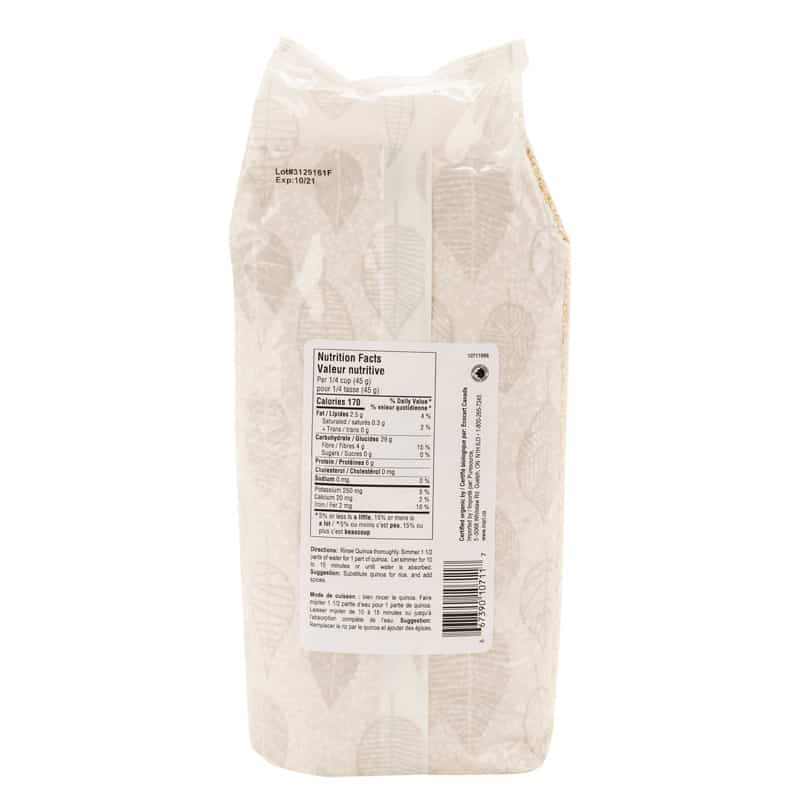 Bien rincer le quinoa. Faire mijoter 1 1/2 partie d’eau pour 1 partie de quinoa. Laisser mijoter de 10 à 15 minutes ou jusqu’à l’absorption complète de l’eau.