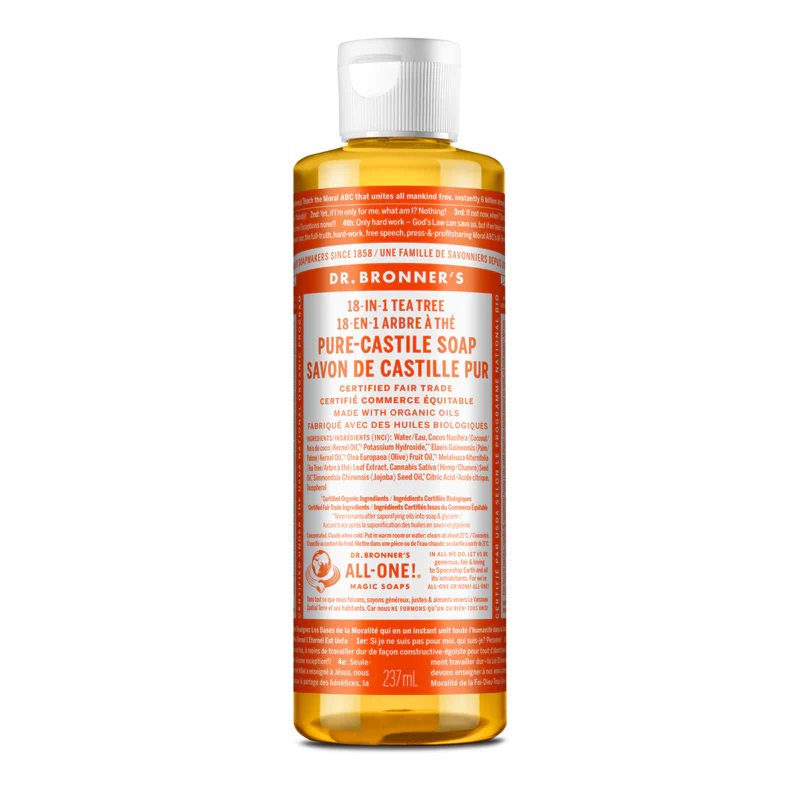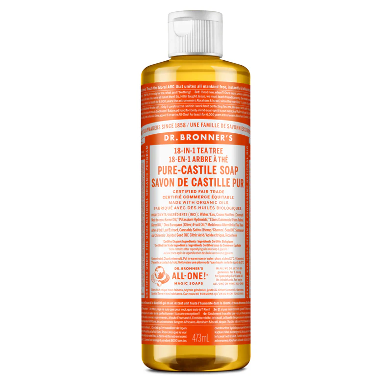 Le Savon de Castille Pur Liquide au parfum d’Arbre à Thé (Tea Tree) 18-en-1 de Dr. Bronner’s convient à presque tous les types de nettoyage. Idéal pour nettoyer le visage, le corps et les cheveux. Il convient aussi parfaitement au lavage des aliments, de la vaisselle, de la lessive, des animaux domestiques et aussi pour la vadrouille! Nettoyez votre maison et également votre corps avec le même savon est tout à fait possible. Ne contenant pas d’agents de conservation synthétiques, ni de détergents ou d’agents moussants, ce savon naturel est conçu avec des ingrédients biologiques et provenant de commerce équitable.