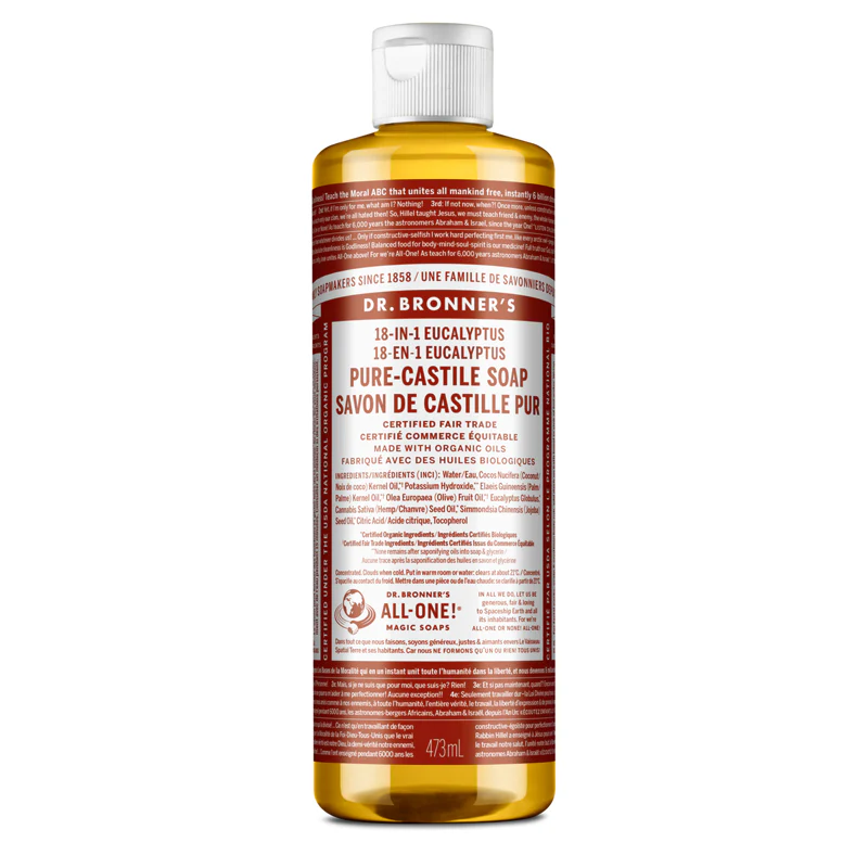 Le Savon de Castille Pur Liquide Eucalyptus 18-en-1 de Dr. Bronner’s convient à presque tous les types de nettoyage. Idéal pour nettoyer le visage, le corps et les cheveux. Il convient aussi parfaitement au lavage des aliments, de la vaisselle, de la lessive, des animaux domestiques et aussi pour la vadrouille! Nettoyez votre maison et également votre corps avec le même savon est tout à fait possible. Ne contenant pas d’agents de conservation synthétiques, ni de détergents ou d’agents moussants, ce savon naturel est conçu avec des ingrédients biologiques et provenant de commerce équitable.