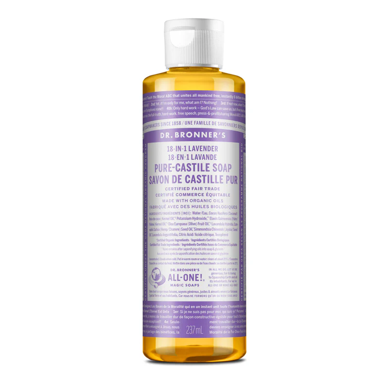 Le Savon de Castille Pur Liquide à la Lavande 18-en-1 de Dr. Bronner’s convient à presque tous les types de nettoyage. Idéal pour nettoyer le visage, le corps et les cheveux. Il convient aussi parfaitement au lavage des aliments, de la vaisselle, de la lessive, des animaux domestiques et aussi pour la vadrouille! Nettoyez votre maison et également votre corps avec le même savon est tout à fait possible. Ne contenant pas d’agents de conservation synthétiques, ni de détergents ou d’agents moussants, ce savon naturel est conçu avec des ingrédients biologiques et provenant de commerce équitable.