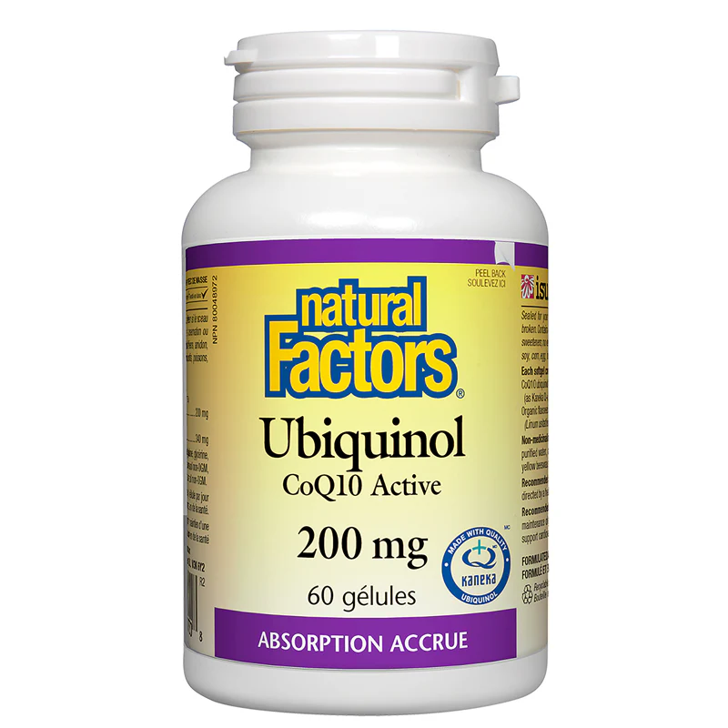 Nutriment essentiel semblable aux vitamines, la coenzyme Q10 facilite la libération d’énergie utilisée pour les processus métaboliques. Vu son rôle dans la synthèse de l’ATP, la CoQ10 influe sur le fonctionnement de toutes les cellules du corps et est donc essentielle à la santé de tous les tissus et tous les organes. Elle est reconnue pour ses effets bénéfiques sur les performances du système immunitaire, du système cardiovasculaire, du foie et des reins. La CoQ10 fournit aussi une protection antioxydante. L’avancement en âge peut entraîner un manque de CoQ10 que l’on associe à un grand nombre de pathologies. Par ailleurs, on note des taux de CoQ10 plus bas chez les personnes qui prennent des statines (médicaments hypocholestérolémiants). Puisque la CoQ10 a une affinité pour les organes ayant des besoins énergétiques plus élevés – comme les reins, le foie, le cœur et le cerveau – la prise d’un supplément aide à redonner de l’énergie et de la vitalité à ces tissus et favorise le maintien d’une bonne santé. Ubiquinol QH Active CoQ10 de Natural Factors est constitué de la forme active de CoQ10, celle produite par nos cellules et qui offre une absorption significativement supérieure, surtout à mesure que nous vieillissons. Ces gélules renferment également de l’huile de lin biologique, une source d’acides gras oméga-3 et d’acide alpha-linolénique (AAL) qui favorisent le maintien d’une bonne santé.